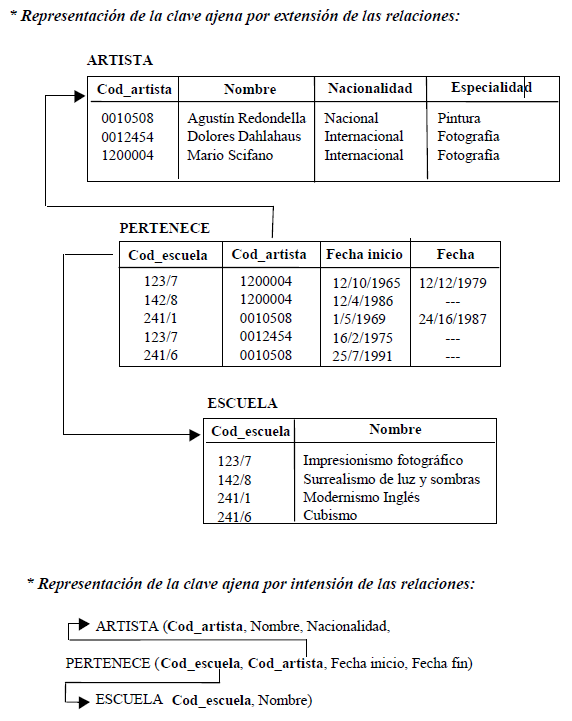 - Integridad referencial: Forma en la que los datos de dos o más tablas se deben relacionar para no atentar contra la integridad de la base de datos (que no haya información repetida). Esto se hace a través de la Clave Ajena o FOREIGN KEY en SQL. Se representa mediante una flecha que sale de la clave ajena y apunta hacia la clave primaria de la tabla con la que se relaciona. Podemos ver un ejemplo: