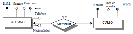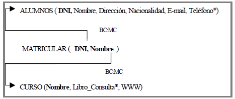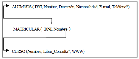 - Segunda regla de transformación: las interrelaciones cuyo tipo de correspondencia es N:M se transforman en una nueva relación cuyo nombre se corresponde con el nombre de la interrelación y donde la clave primaria se compone de los atributos identificadores de las dos entidades que relaciona.