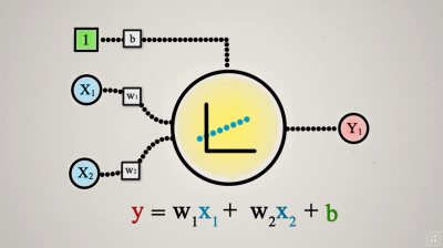 Podemos ver que una neurona es básicamente un modelo de regresión lineal. Aparentemente falta el término independiente W0, que en el caso de 1 dimensión permitía mover la recta en el eje Y. En este caso será el término BIAS (b), que es una entrada con valor '1', y como parámetro b, que permite este ajuste. De este modo obtenemos Y = W1X1 + W2X2 + W3X3 + b