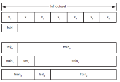 La técnica consiste en dividir el dataset completo, previamente reordenado de forma aleatoria, en diferentes k subtramas no solapadas: x0, x1, x2, …, Xk-1. k es un valor arbitrario, habitualmente entre 5 y 10.