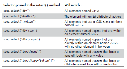 >>> import bs4 >>> exampleFile = open('example.html') >>> exampleSoup = bs4.BeautifulSoup(exampleFile.read(), 'html.parser') >>> elems = exampleSoup.select('#author') >>> type(elems) # elems is a list of Tag objects. <class 'list'> >>> len(elems) 1 >>> type(elems[0]) <class 'bs4.element.Tag'> >>> str(elems[0]) # The Tag object as a string. '<span id="author">Al Sweigart</span>' >>> elems[0].getText() 'Al Sweigart' >>> elems[0].attrs {'id': 'author'} >>> pElems = exampleSoup.select('p') >>> str(pElems[0]) '<p>Download my <strong>Python</strong> book from <a href="https:// inventwithpython.com">my website</a>.</p>' >>> pElems[0].getText() 'Download my Python book from my website.' >>> str(pElems[1]) '<p class="slogan">Learn Python the easy way!</p>' >>> pElems[1].getText() 'Learn Python the easy way!' >>> str(pElems[2]) '<p>By <span id="author">Al Sweigart</span></p>' >>> pElems[2].getText() 'By Al Sweigart'